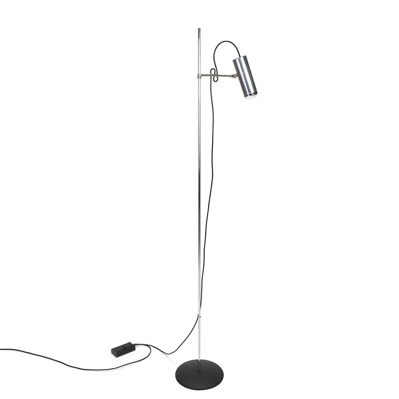 Vintage vloerlamp uit de eind jaren vijftig, begin jaren zestig. Minimalistisch design met bijzonder detail, door het gewicht van de chromen koker kan de hoogte worden gesteld. De voet is overtrokken met zwart skai. De conditie is goed gezien de leeftijd, de bedrading is vervangen en er is een vloerdimmer geplaatst, zie details. De afmetingen zijn 162,5 cm hoog, de koker met fitting is 15 cm lang en 6,3 cm in diameter.