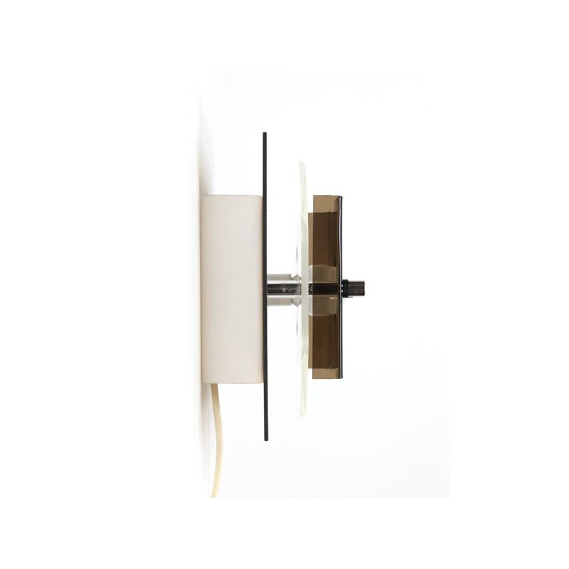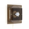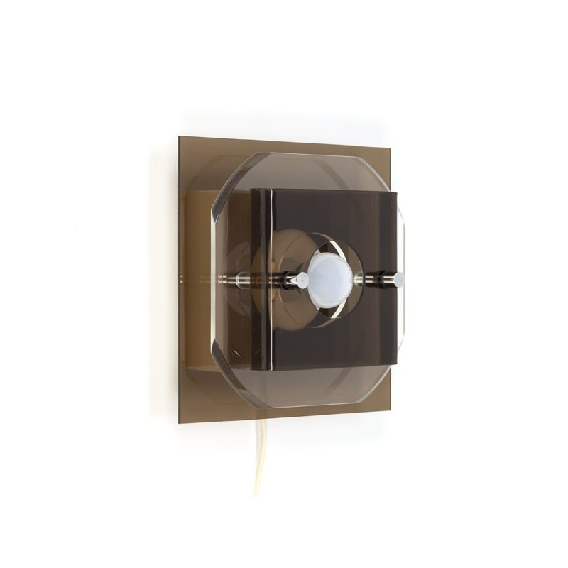Vintage wandlamp uit de zeventiger jaren, uitgevoerd in plexiglas. De lamp geeft een mooi warm licht. De conditie is goed gezien de leeftijd, zie ook de detailfoto's. De afmeting is 22 cm L/ 22 cm H/ 11,5 cm D.