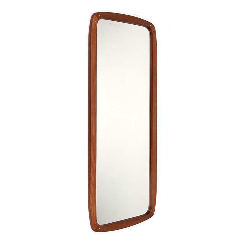 Teakhouten Deense spiegel uit de zestiger jaren. Mooi model met klein messing kleurig detail in de hoeken. De conditie is goed, wel is er in de linker hoek een vlek zichtbaar in de spiegel zelf, zie details. De afmetingen zijn 41,5 cm breed en 95,5 cm hoog.