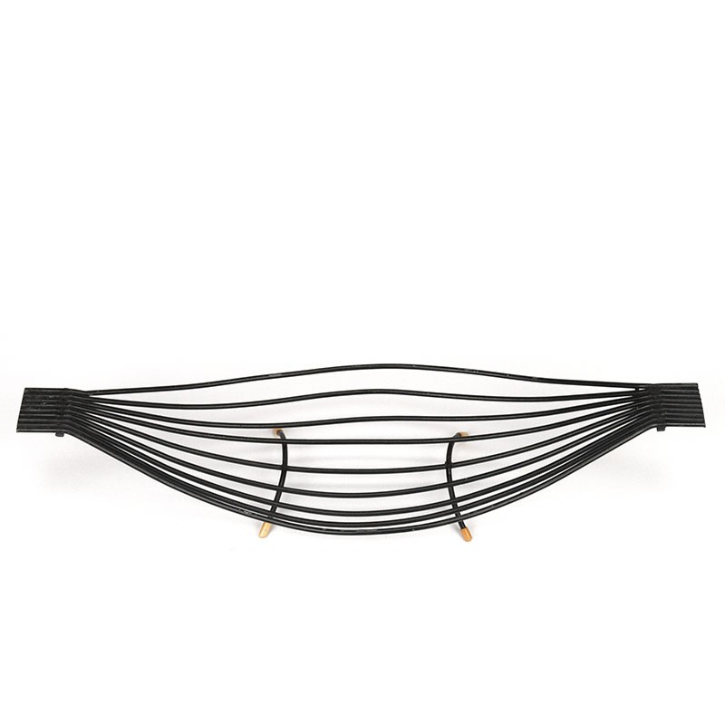 Fruitschaal uit de vijftiger jaren. Uitgevoerd in draadmetaal, zwart van kleur. De conditie is redelijk goed, er zijn enkele gebruikssporen zichtbaar. De afmetingen zijn 43 cm lang en 14,5 cm breed.
