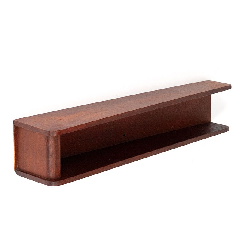 Vintage open wandplankje uit Denemarken, periode 1960-1969. Leuk model dat qua vorm iets schuin weg loopt. De conditie is goed gezien de leeftijd, enkel minimale gebruikssporen, zie details. De afmetingen zijn 48 cm lang, 10 cm diep en 9,5 cm hoog.
