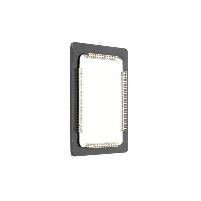 Vintage spiegel met een geperforeerd metalen rand, ontworpen in de stijl van Pilastro. De conditie is goed gezien de leeftijd, zie detailfoto's. De afmeting is 31,5 cm hoog en 24 cm breed.