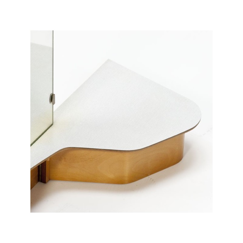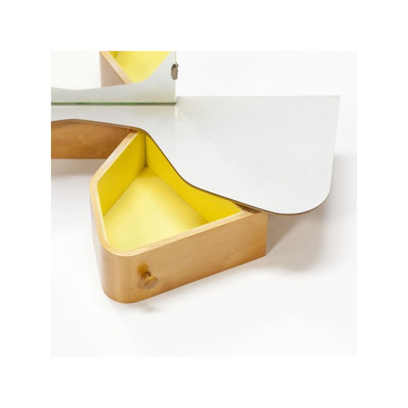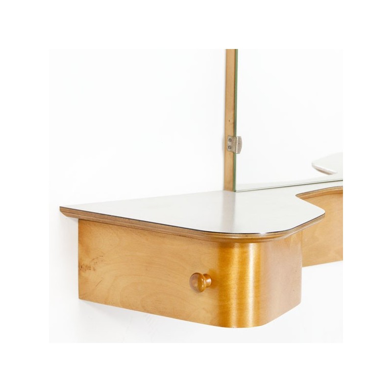 Muur kaptafel, onderdeel van de berkenserie, ontworpen door Cees Braakman voor Pastoe in de begin jaren vijftig. Prachtige plywood details. Gemerkt met een stempel van de fabrikant aan de achterzijde. De conditie is zeer goed, zie de detailfoto's. De afmeting is 71 cm H/ 80 B/ 25 D.