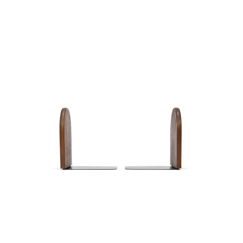Set van 2 vintage boekensteunen uitgevoerd in teak en zwart metaal. De conditie is goed, het metaal is wat gekrast, zie ook de detailfoto's. De afmeting is 12 cm hoog en 9,5 cm breed.