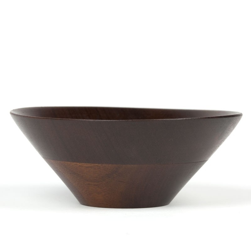 Klein vintage schaaltje, uitgevoerd in donker teakhout, met mooie vormgeving. De conditie is goed, zie de details. De afmeting is 14 cm in diameter en 5,5 cm hoog.