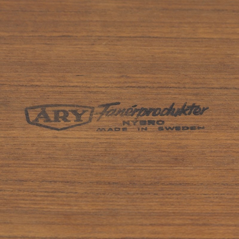 Vintage langwerpig dienblad van teakhout, klein model. Aan de onderzijde gemerkt: Ary. De conditie is goed gezien de leeftijd, zie de details. De afmetingen zijn 41 cm lang en 16,5 cm breed.