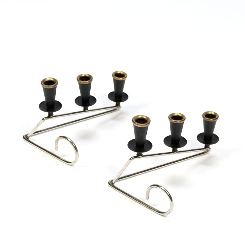 Vintage jaren vijftig set van 2 kandelaren. Chroom onderstel met 3 zwart metalen houders met messing ring. Zeer decoratief. De conditie is goed gezien de leeftijd, zie de details. De afmetingen zijn 15 cm lang, 10 cm breed en 10 cm hoog.