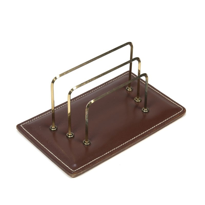 Vintage leren brievenhouder met messing en een opvallend stiksel. Het ontwerp van de brievenhouder is toegeschreven aan de Franse ontwerper Jacques Adnet uit de vijftiger jaren. De conditie is goed gezien de leeftijd, zie de details. De afmetingen zijn 24 cm breed, 14,5 cm diep en 10,5 cm hoog.