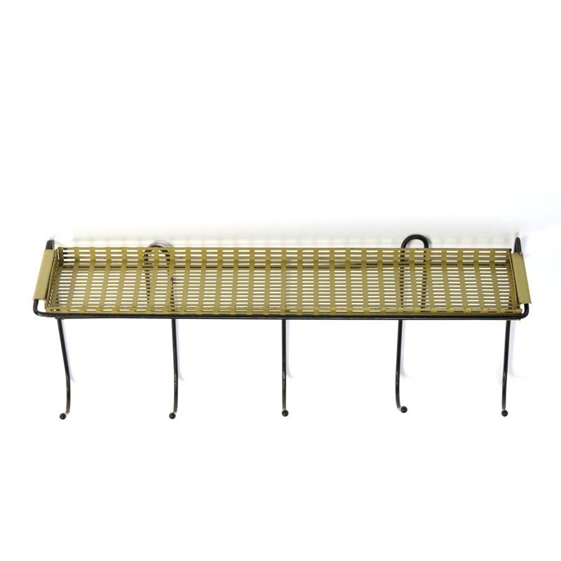 Vintage wandrek uit de eind vijftiger jaren in de stijl van Pilastro. Het rekje kan gebruikt worden als kapstok, maar ook als bijvoorbeeld pannenrekje. Het frame is zwart en het plankje is groen van kleur. De conditie is redelijk goed gezien de leeftijd, er zijn lichte gebruikssporen passend bij de leeftijd, zie de details. De afmetingen zijn 51 cm lang, 13,5 cm diep en 22,5 cm hoog.