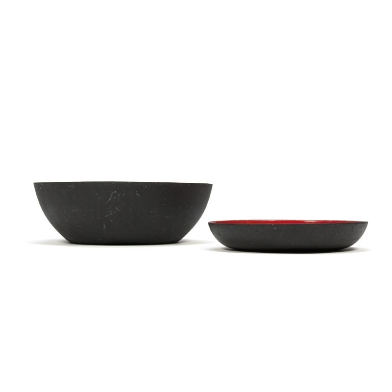 Vintage set van 2 schaaltje uit de zestiger jaren. De schaaltjes komen uit Finland en zijn van emaille, de buitenzijde is zwart en de binnenzijde rood. De conditie si redelijk goed, wel zijn er gebruikssporen passend bij de leeftijd, zie de details. De afmetingen zijn 22 cm in diameter bij 7 cm hoog en 16,5 cm in diameter bij 3 cm hoog.