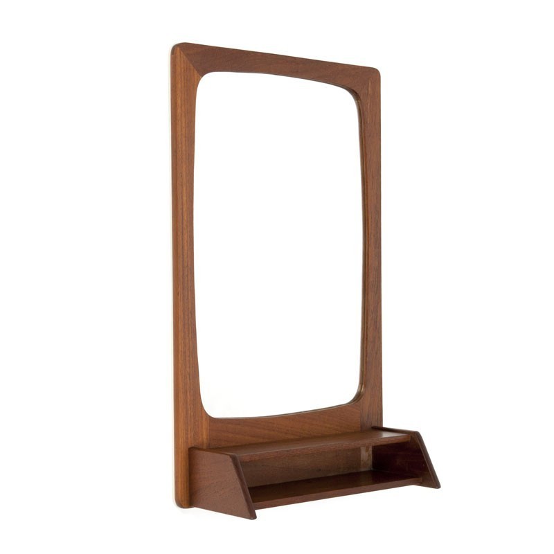 Vintage Deense teakhouten spiegel. De Spiegel komt uit de zestiger jaren en heeft een mooie brede, organisch gevormde rand en een klein vakje onder de spiegel zelf. De conditie is goed gezien de leeftijd, zie de details. De afmetingen zijn 33,5 cm breed, 12,5 cm diep en 53,5 cm hoog.