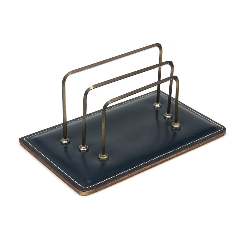 Vintage brievenhouder met groen leren voet en messing details. Ontworpen in de stijl van de franse ontwerper Jacques Adnet. De conditie is goed gezien de leeftijd, zie de details. De afmetingen zijn 24 cm lang, 14,5 cm breed en 11 cm hoog.