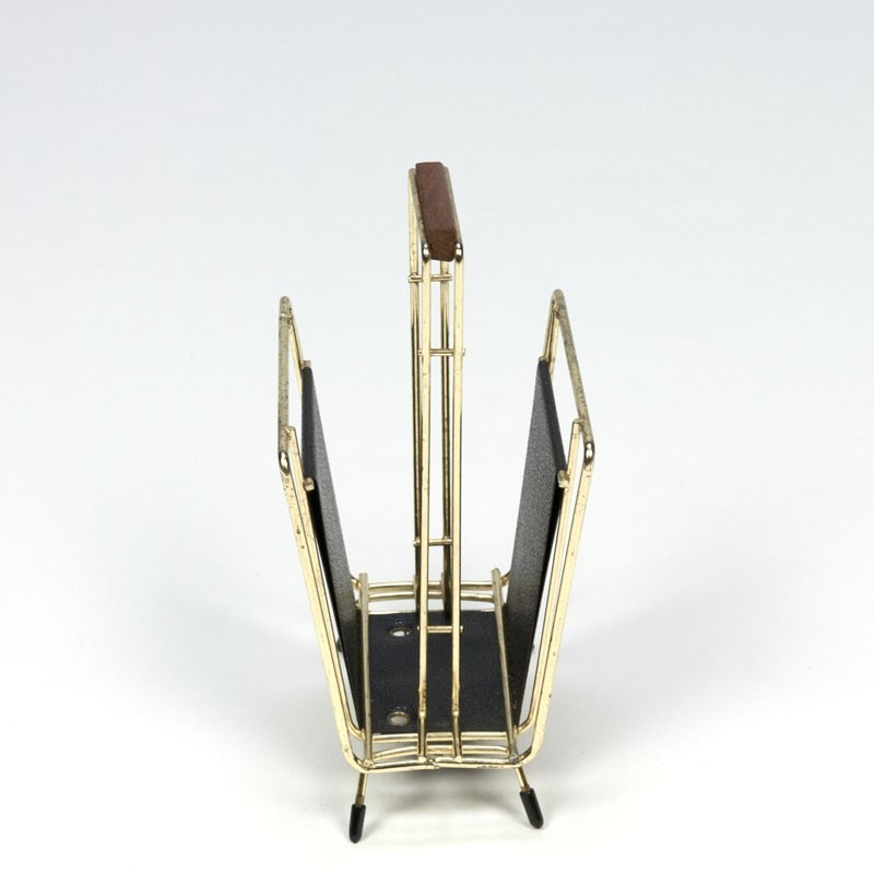 Vintage messing kleurige brieven- en of servetten houder. Afkomstig uit de zestiger jaren met klein teak detail en een afbeelding van een Morris auto. De conditie is goed gezien de leeftijd, zie de details. De afmetingen zijn 10,5 cm breed, 8,3 cm diep en 17,2 cm hoog.