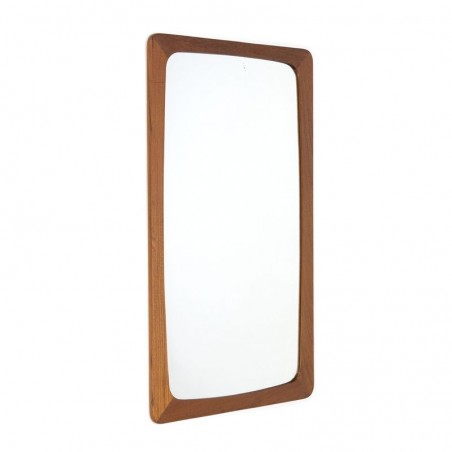 Deense vintage spiegel uit de zestiger jaren. De rand is uitgevoerd in teakhout en heeft ronde organische vormen. De conditie is goed gezien de leeftijd, zie de details. De afmetingen zijn 36 cm breed en 63 cm hoog.