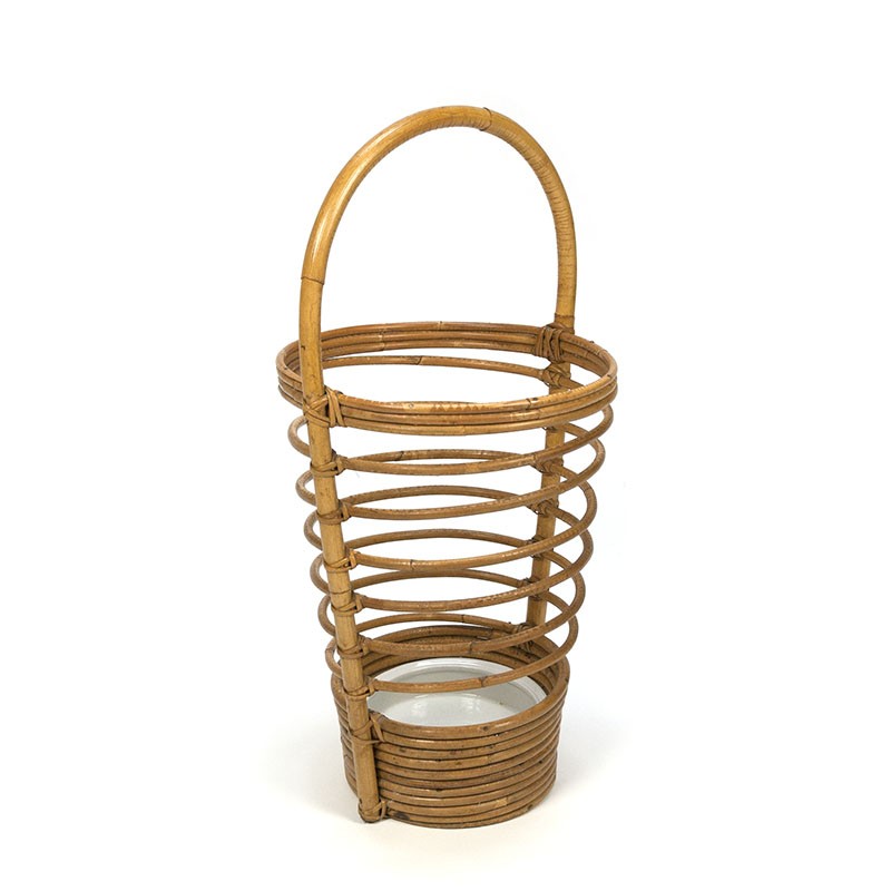 Bijzondere vintage paraplustandaard uit de zestiger/ zeventiger jaren. De paraplustandaard is gemaakt van rotan en heeft een aardewerken schaal op de bodem. De conditie is goed, het rotan is intact, zie details. De afmetingen zijn 31,5 cm breed, 28 cm diep en 60 cm hoog.