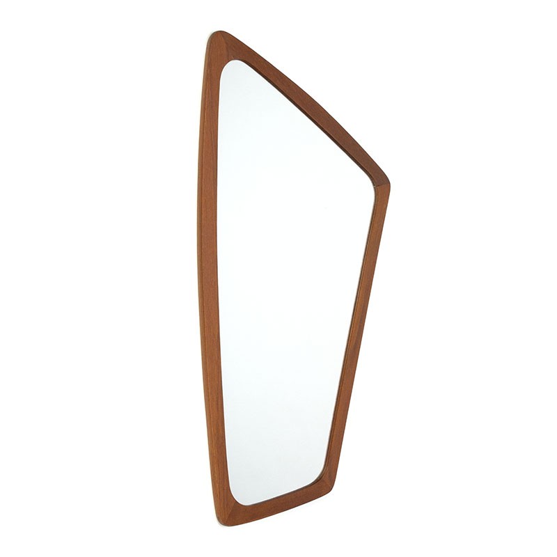 Deense organisch vormgegeven design spiegel. De spiegel komt uit de zestiger jaren en heeft een teakhouten rand. De conditie is goed, minimale gebruikssporen, zie details. De afmetingen zijn 36,5 cm breed en 67 cm hoog.