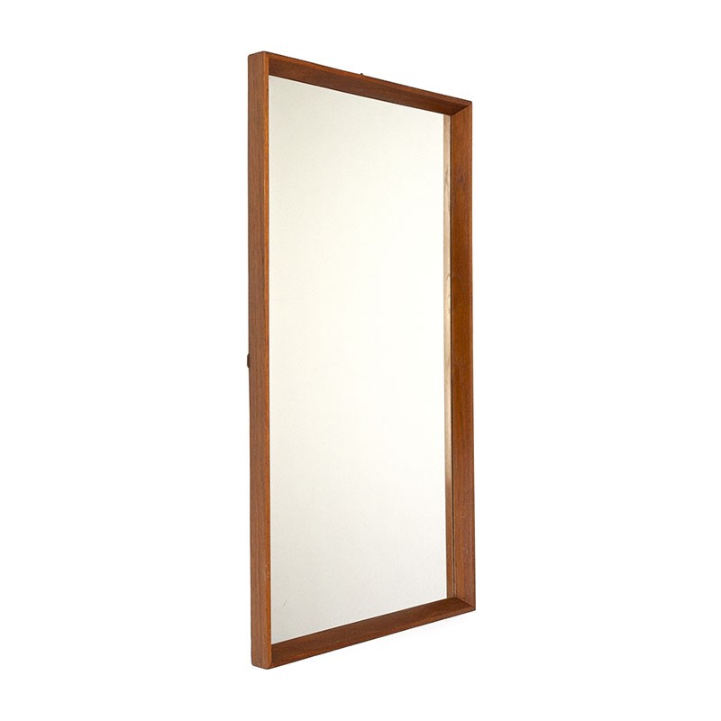 Spiegel uit de zestiger jaren, gemaakt in Denemarken. De vintage spiegel kan op zowel in de lengte als de breedte worden opgehangen. Gemerkt aan de achterzijde. De conditie is goed gezien de leeftijd, lichte gebruikssporen, zie details. De afmetingen zijn 39 cm breed, 3 cm diep en 72 cm hoog.
