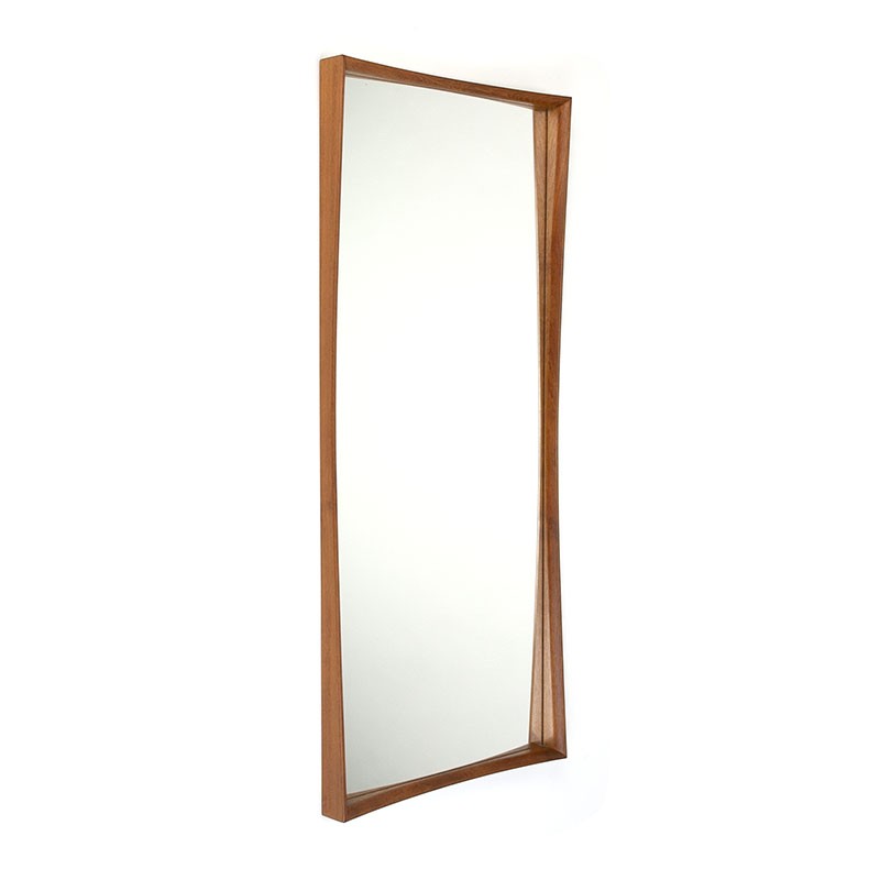 Deense spiegel uit de zestiger jaren. Bijzonder vormgegeven model met ronde vormen. De vintage spiegel komt uit de Aarhus glasimport fabriek en is gemerkt en genummerd aan de achterzijde. De conditie is goed gezien de leeftijd, minimale gebruikssporen, zie details. De afmetingen zijn 42,5 cm breed, 4,5 cm diep en 96 cm hoog.