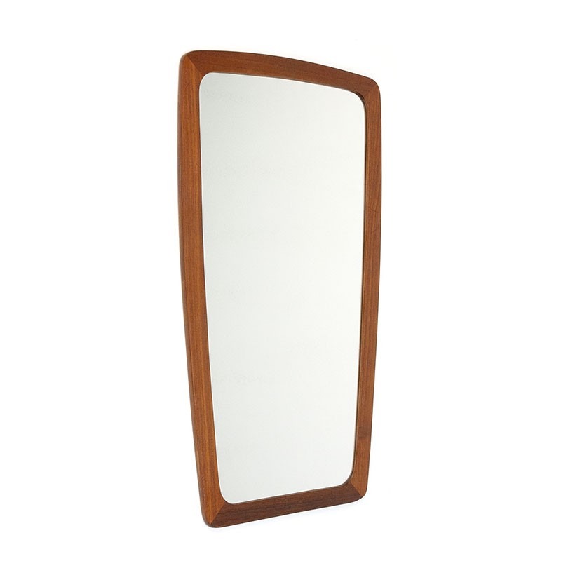 Spiegel uit Denemarken, uit de zestiger jaren. Mooi vintage model met teakhouten rand, met licht organische vormgeving. De conditie is goed, lichte gebruikssporen passend bij de leeftijd, zie details. De afmetingen zijn 34 cm breed en 60 cm hoog.