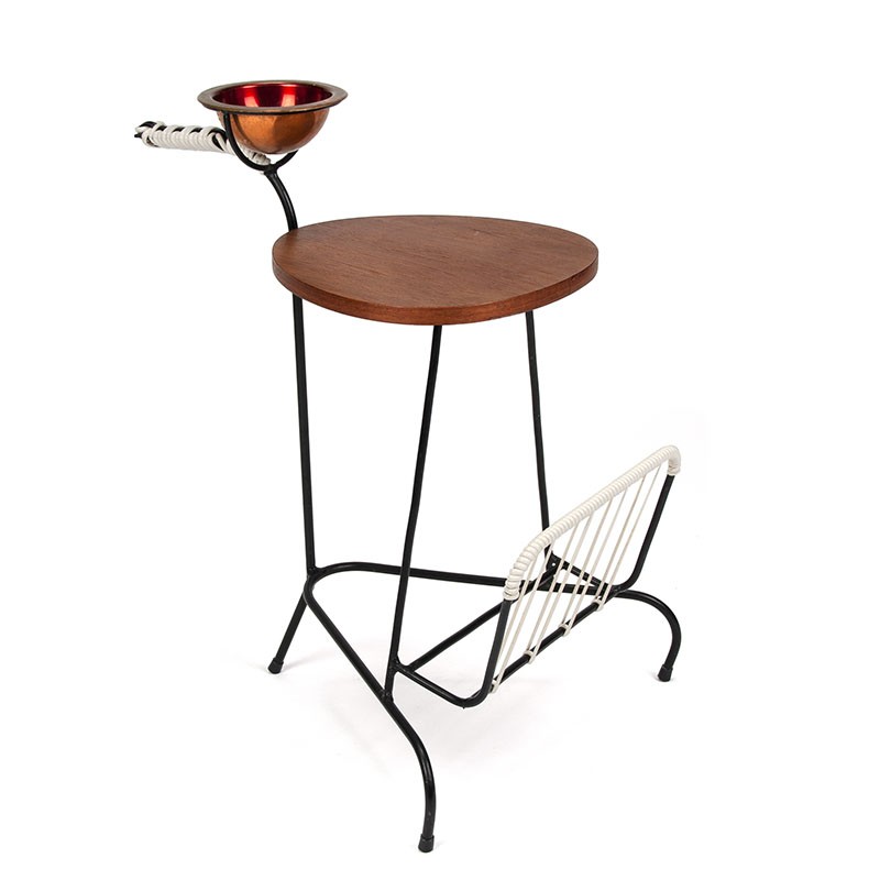 Deens jaren vijftig bijzettafeltje met asbakje en magazine rek. Mooi tafeltje van gecoat metaal gedecoreerd met wit/ creme kleurig plastic draad. De conditie is goed gezien de leeftijd, enkel minimale gebruikssporen, zie details. De afmetingen zijn totaal 49,5 cm hoog, 39 cm totaal het teakhouten blad, de lengte is 45 cm en 24,5 cm breed.