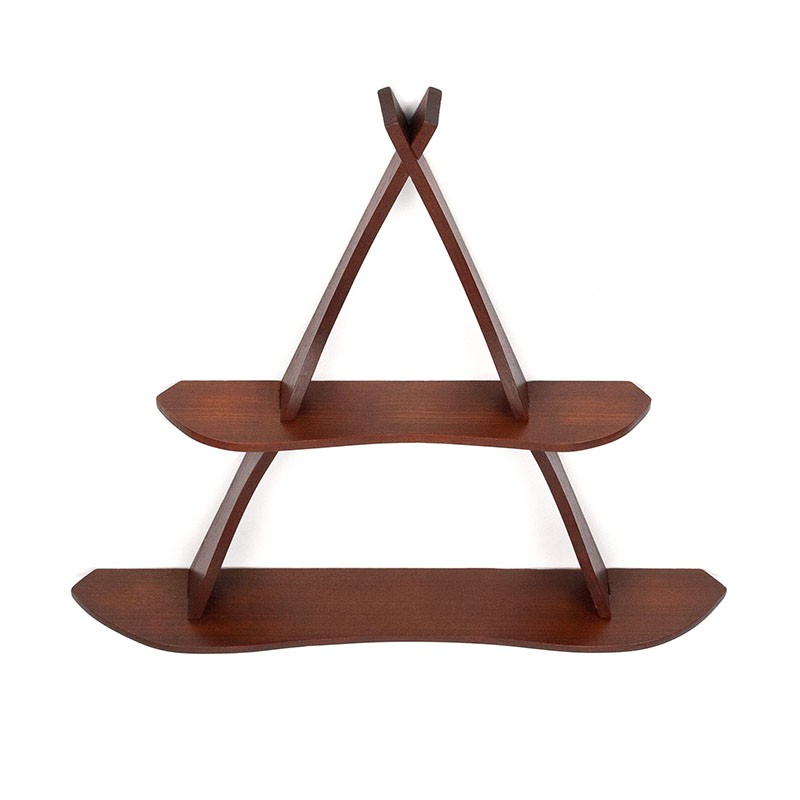 Deens wand/ kruidenrek uit de eind vijftiger, begin zestiger jaren. Uitgevoerd in teakhout met organische vormen. Het rekje bestaat uit losse onderdelen die in elkaar vallen. De conditie is goed, minimale gebruikssporen, zie details. De afmetingen zijn 58 cm breed, 9,5 cm diep en 58 cm hoog.