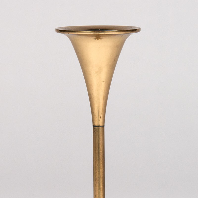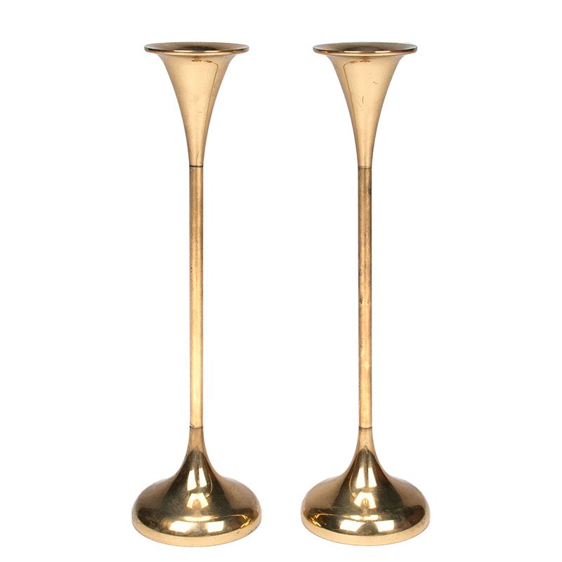 Set van 2 kandelaar van het Deense merk CAWA. Mooie slanke set, uitgevoerd in messing. Afkomstig uit de Mid-Century periode, 1960-1970. Gemerkt. De conditie is goed, zie details. De afmetingen zijn 24,5 cm hoog, de diameter is boven 5 cm , e voet is 6,8 cm.