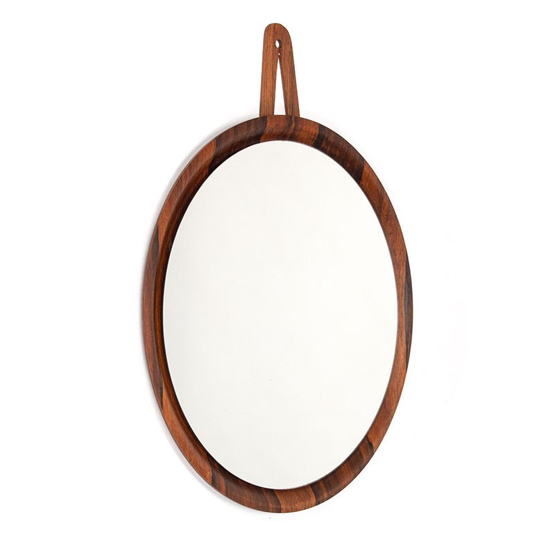 Palissanderhouten vintage spiegel uit de Mid-Century periode. Prachtige minimalistische Scandinavische stijl. De conditie is goed, zie details. De afmetingen zijn 50 cm in diameter en 62 cm hoog ( inclusief hanger).