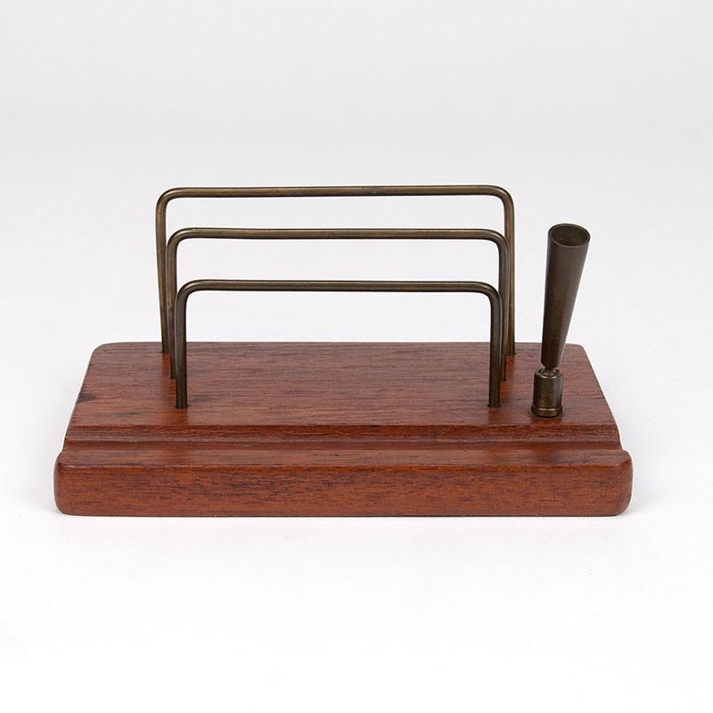 Brief- en pennenhouder uit de eind vijftiger, begin zestiger jaren. Mooi vintage model, afkomstig uit Scandinavië. Teakhouten voet gecombineerd met messing. De conditie is goed gezien de leeftijd, zie details. De afmetingen zijn 19 cm lang, 12,4 cm diep en 8,5 cm hoog.