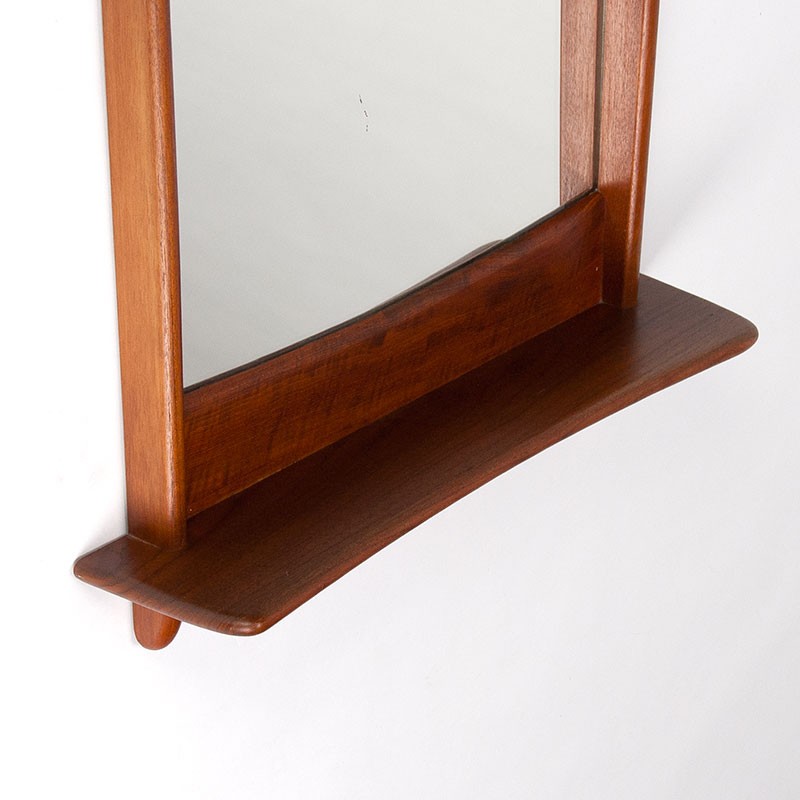 Deense grote teakhouten spiegel uit de periode 1960-1969. Bijzonder vintage model met organische vormen in het ontwerp. Speciaal detail in het ontwerp is het plankje aan de onderzijde. De conditie is goed, klein krasje in het glas verder minimale gebruikssporen, zie details. De afmetingen zijn 103,5 cm hoog, 50,5 breed ( plankje), 42 cm breed ( bovenzijde) en 11,5 cm diep.