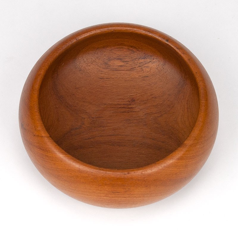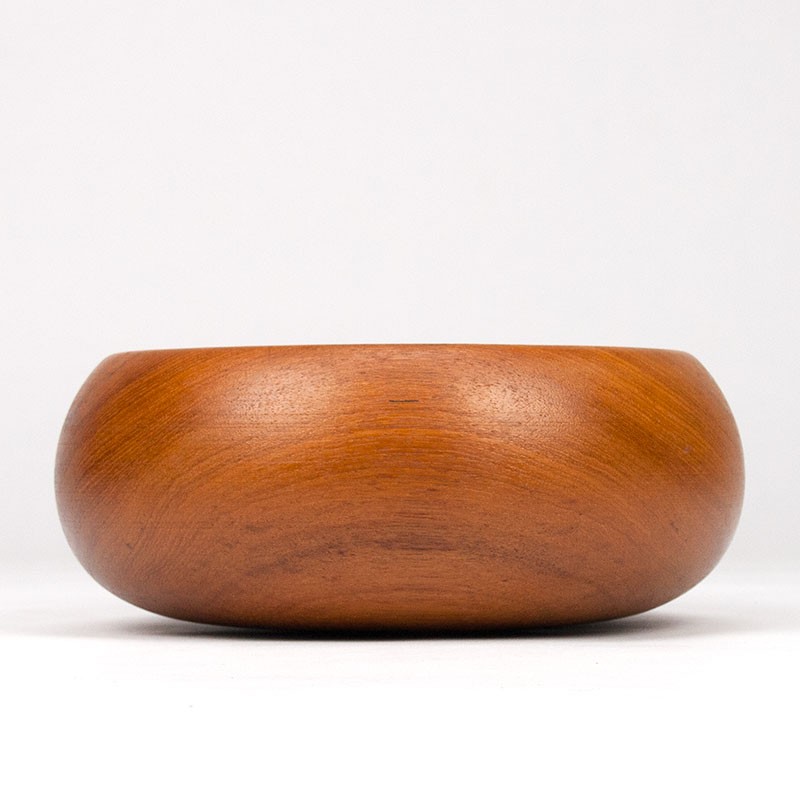 Serveerschaal uit de zestiger jaren. Mooi vintage, rond model uit Denemarken, uitgevoerd in teakhout. De conditie is goed gezien de leeftijd, zie details. De afmetingen zijn 19,5 cm in diameter en 8,5 cm hoog.