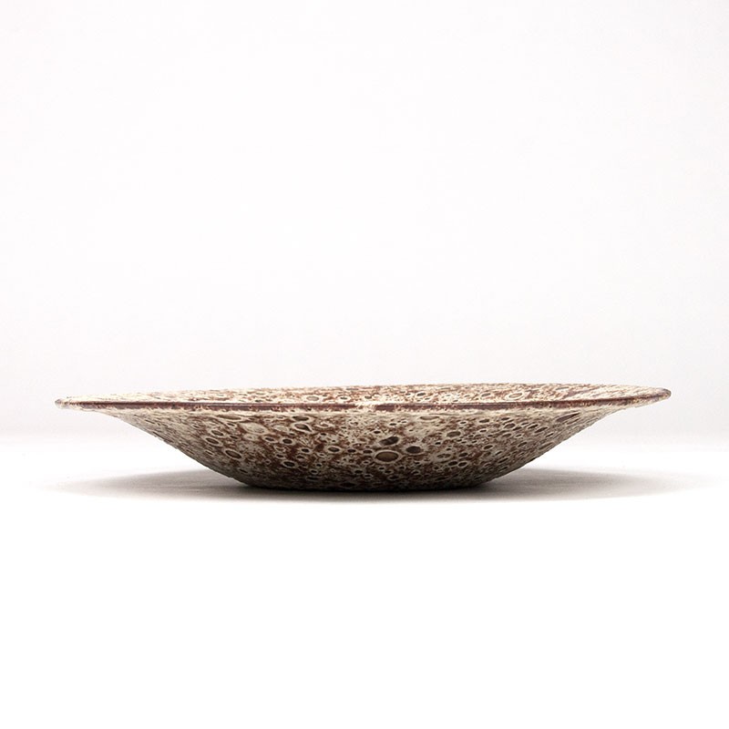 Schaal van keramiek. Uit de Zaalberg potterij. Mooie vintage schaal met bubbel patroon, in lichte bruin tint. Gemerkt aan de onderzijde. De conditie is goed, onbeschadigd, zie details. De afmetingen zijn 24,5 cm in diameter en 4 cm hoog.