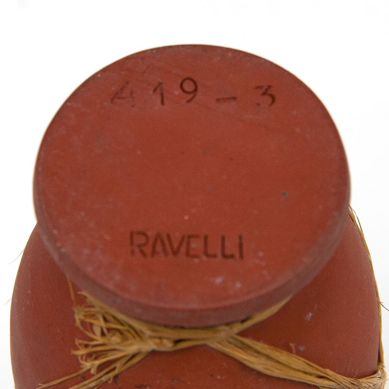 Bijzonder vaasje van het Nederlandse keramiek merk Ravelli, Valkenburg. Terracotta buitenzijde en wit geglazuurde binnenzijde, versiert met raffia. Gemerkt aan de onderzijde. De conditie is goed, onbeschadigd, zie details. De afmetingen zijn 6 cm in diameter en 14 cm hoog.