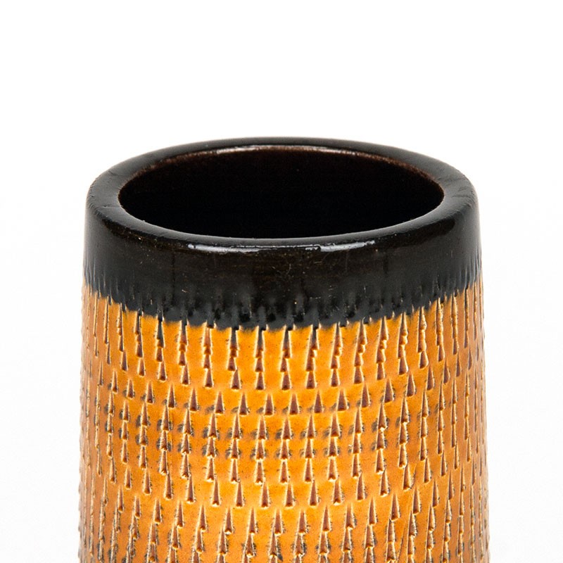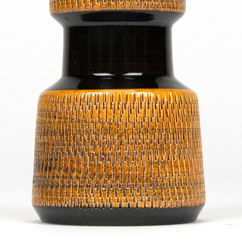 Bijzonder vormgegeven vaas van het Duitse merk Bay Keramik. Vintage vaas uit de zestiger jaren in de kleuren geel en donker bruin. Gemerkt aan de onderzijde. De conditie is goed, onbeschadigd, zie details. De afmetingen zijn 25,5 cm hoog en 8,5 cm in diameter.