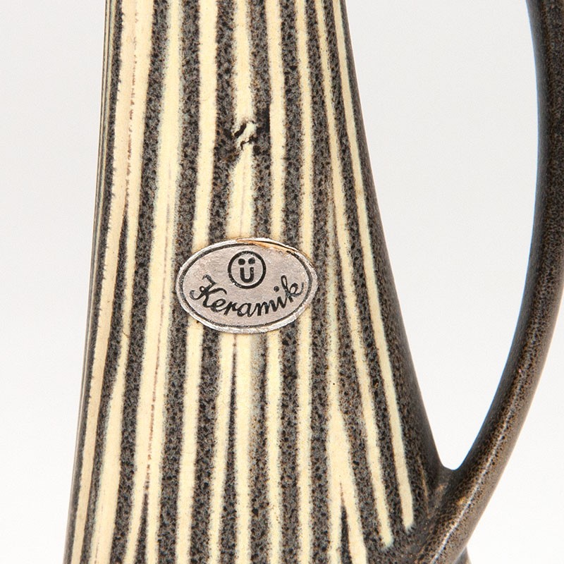Jaren vijftig vaas, bijzonder stijlvol model, van keramiek. De vaas is gemerkt met een sticker en genummerd aan de onderzijde, 433/22. De conditie is goed, onbeschadigd, zie details. De afmetingen zijn 10 cm breed, 6,5 cm diep en 22 mc hoog.