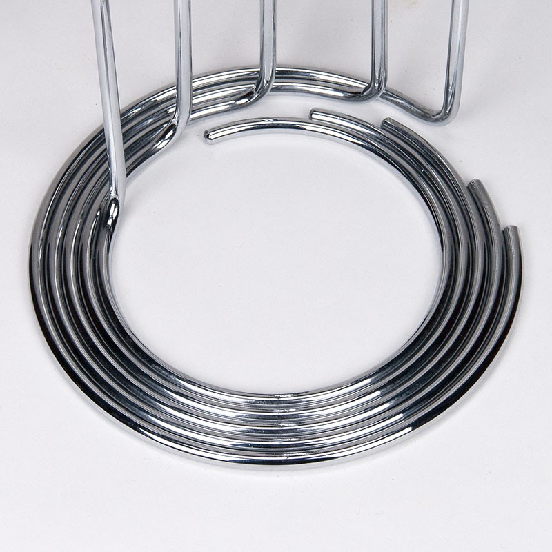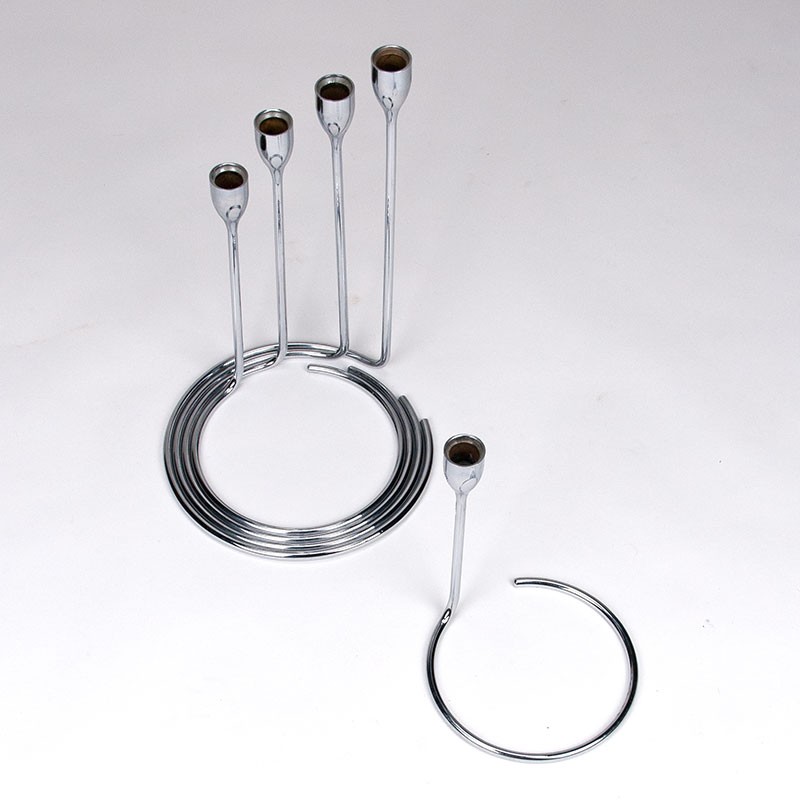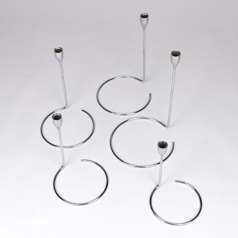 Set design kandelaars uit de begin jaren zeventig. Bijzondere vintage set, uitgevoerd in verchroomd metaal. De set bestaat uit 5 losse onderdelen die samen een geheel vormen. De conditie is goed, zie details. De afmetingen zijn maximaal 35,5 cm hoog en minimaal 22 cm hoog, de diameter is maximaal 23,5 cm en minimaal 17 cm.
