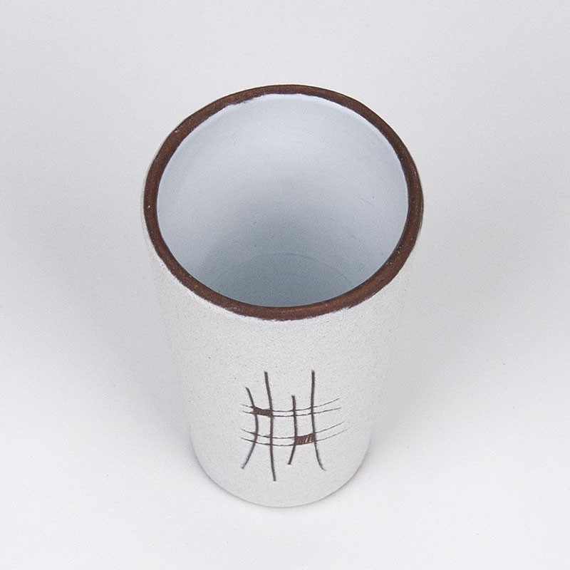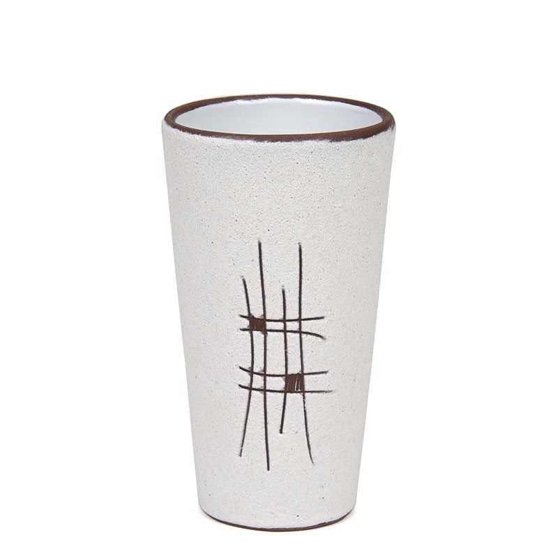 Vintage vaasje uit de periode 1950-1969. Leuk model met abstracte voorstelling. De conditie is goed, onbeschadigd, zie details. De afmetingen zijn 12,8 cm hoog en 7,3 in diameter.