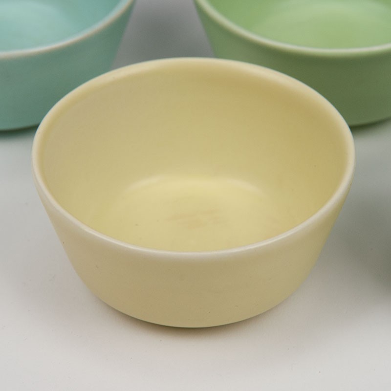 Vintage set uit het Goedewaagen Gouda aardewerk atelier, periode 1955-1965. Mooi gemerkt aan de onderzijde in vrolijke pastel kleuren. Let op: het blauwe schaaltje heeft een barst. Conditie is verder goed. De afmetingen zijn van het grootste schaaltje 16,5 cm in. diameter en 5,2 cm hoog, de pastel kleurige bakjes zijn 7,8 cm in diameter en 3,5 cm hoog.
