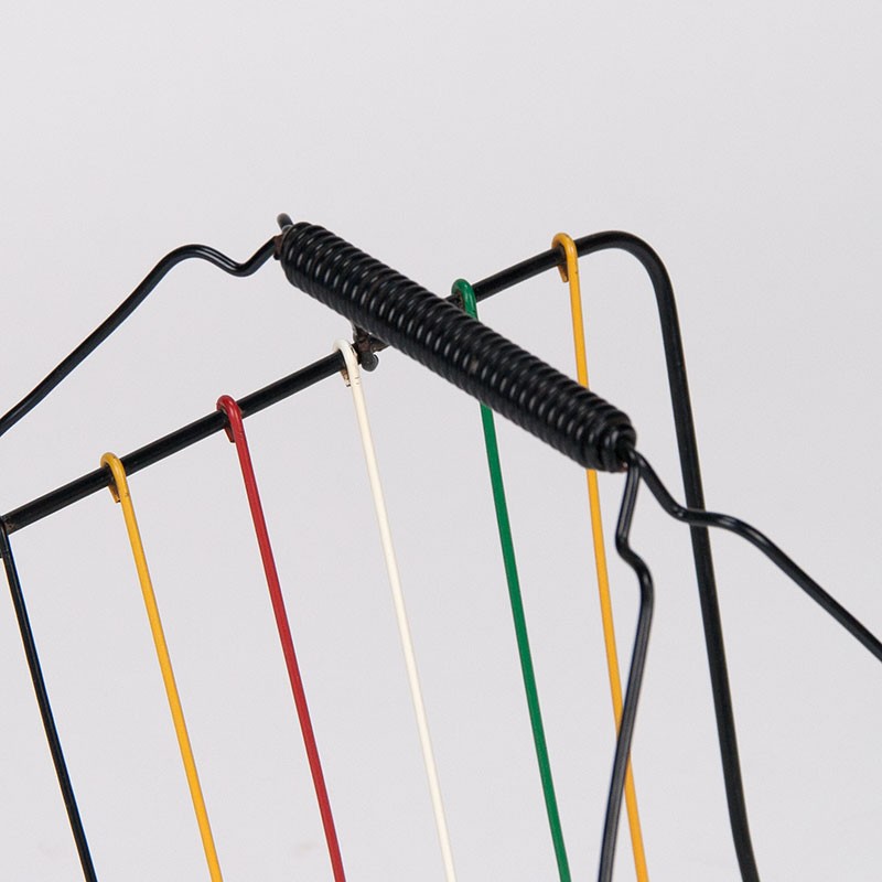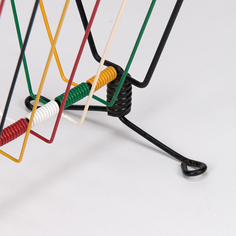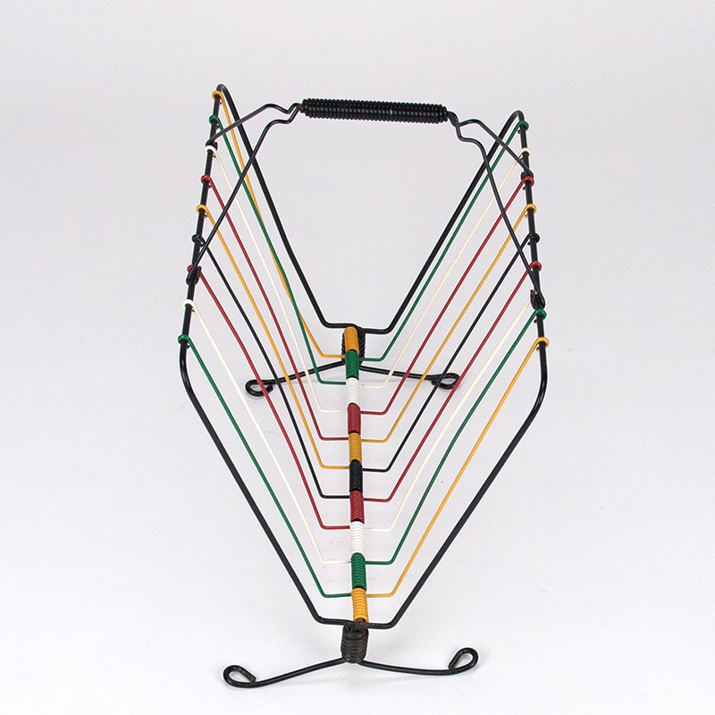 Vintage krantenrek uit de vijftiger/ zestiger jaren. Zwart gecoat metalen frame, met gekleurde details. De conditie is redelijk goed gezien de leeftijd ( niet 100% recht wat het rekje juist zijn speciale patina geeft). Afmetingen zijn 35,5 cm lang, 25 cm breed en 41 cm hoog.