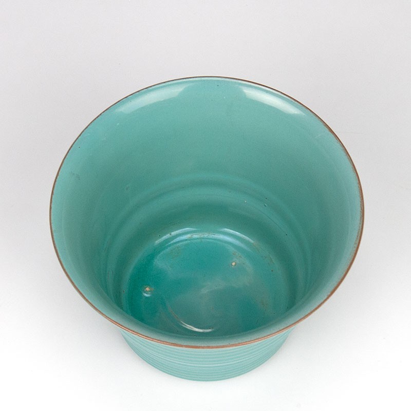 Groot model vintage bloempot in groen blauwe kleur. Afkomstig uit de aardewerkfabriek ADCO, Confido of Wenco. Merk niet te lezen door dik glazuur aan de onderzijde. De conditie is goed, onbeschadigd. De afmetingen zijn 20,5 cm in diameter en 15 cm hoog.
