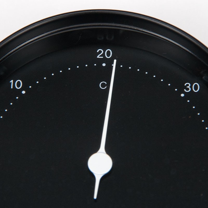 Deense design thermometer, voor aan de wand. Ontworpen door Henning Koppel en uitgebracht door Georg Jensen/ Royal Copenhagen. De conditie is goed, zie details. De afmetingen zijn 10 cm in diameter en 4,5 cm diep.