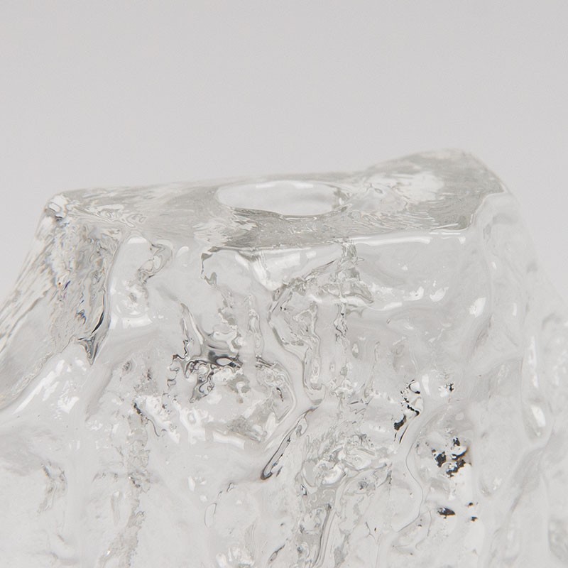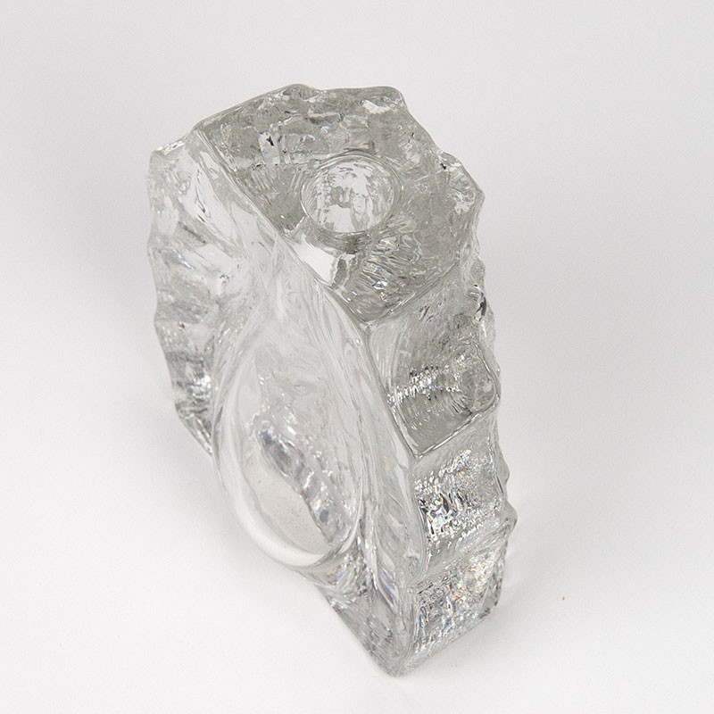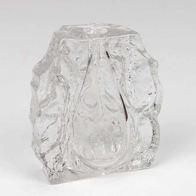 Helder glazen solofleur, vormgegeven als ijsblok, uit de Georgshütte Duitsland. Vintage exemplaar uit de periode 1965-1969. De conditie is goed, onbeschadigd, zie details. De afmetingen zijn 9 cm breed, 4 cm diep en 10 cm hoog.
