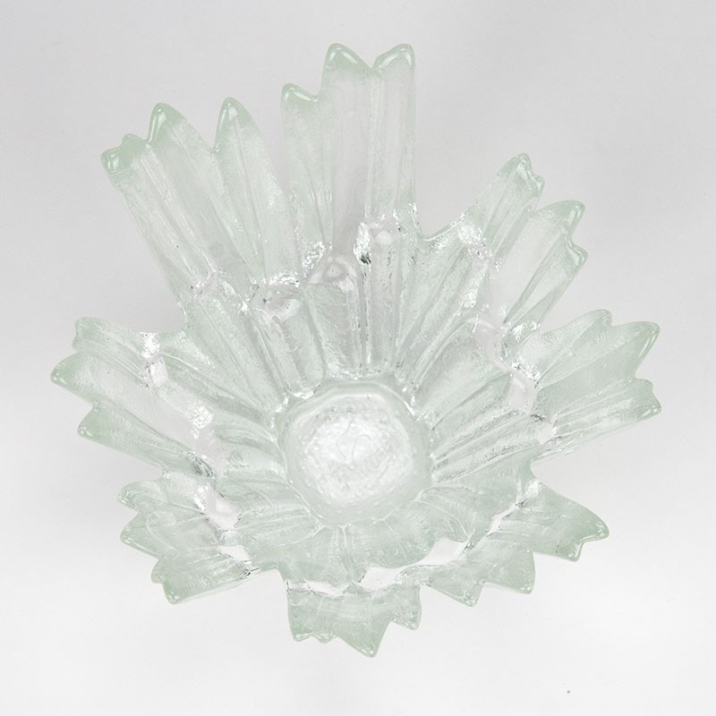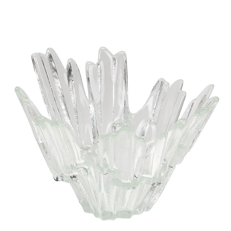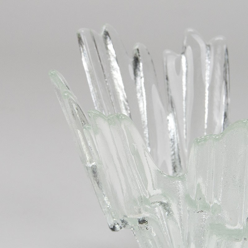 Finse Mid-Century glazen schaal in de vorm van ijs kristallen, met de naam Revontulet, uit de zeventiger jaren. Ontworpen door Tauno Wirkkala en gemaakt in de glasfabriek Humppila in Finland. De conditie is goed, onbeschadigd, zie de details. De afmetingen zijn 21 cm in diameter en 15 cm hoog.