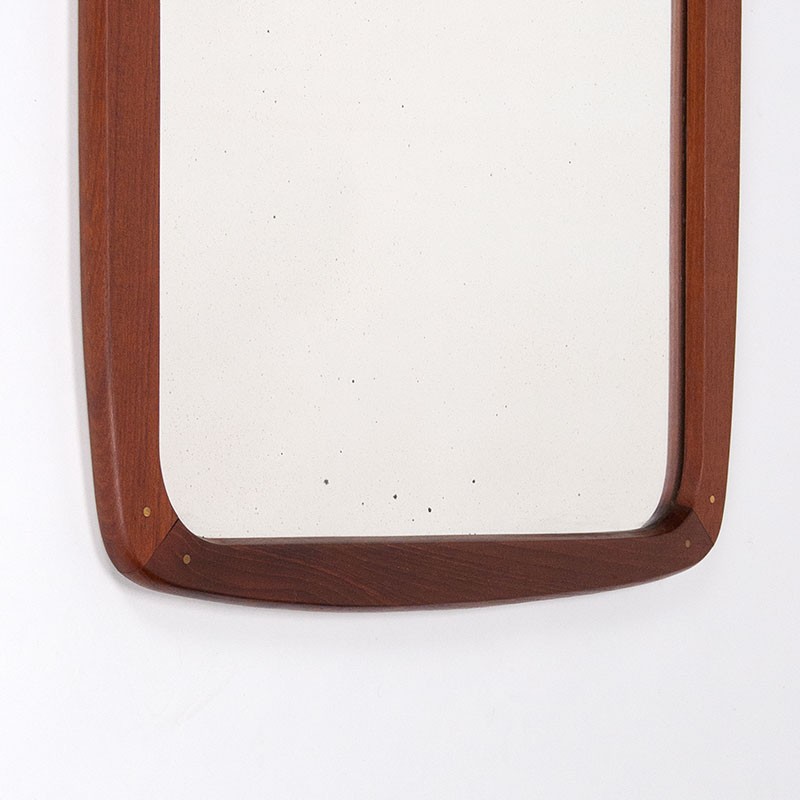 Grote Deense vintage spiegel uit de Mid-Century periode 1955-1969. Mooie teakhouten rand met kleine messing details op de hoeken. De conditie is goed, wel zijn er in het glas van de spiegel wat vlekjes zichtbaar, zie details. De afmetingen zijn 47,5 cm breed en 120,5 cm hoog.