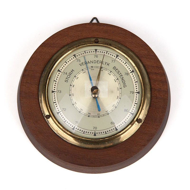 Vintage barometer uit de periode 1955-1965. Model is uitgevoerd in teak en messing. De conditie is goed, zie details. De afmetingen zijn 10,5 cm in diameter en 2 cm diep.