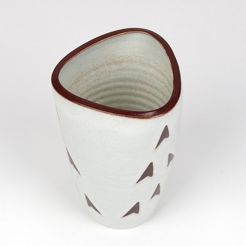 Vintage keramiek vaas van het Nederlandse merk Ravelli. Ontworpen door Jaap Ravelli rond 1955. Mooi driehoek model gedecoreerd. Gemerkt aan de onderzijde. De conditie is goed, onbeschadigd, zie details. De afmetingen zijn 17,3 cm hoog ne 11 cm in diameter.