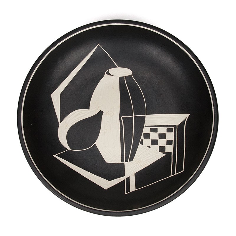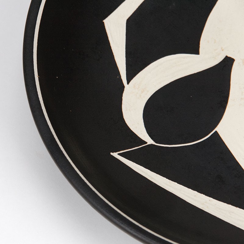 Decoratieve schaal uit de vijftiger jaren, Denemarken. Gemaakt in het atelier van Søholm Bornholm. De schaal is gemerkt en genummerd. Mooie abstracte afbeelding. De schaal kan hangen, maar de afbeelding hangt dan niet recht. De conditie is goed, geen snips, witte delen iets verweerd, zie details. De afmetingen zijn 32,5 cm in diameter en 6 cm hoog.