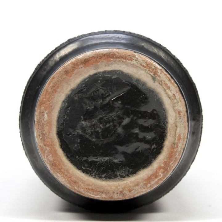 Kleine smalle aardewerken vintage vaas. De kleur is antraciet met bordeaux kleurige details. De conditie is goed, onbeschadigd, zie de details. De hoogte is 18 cm.