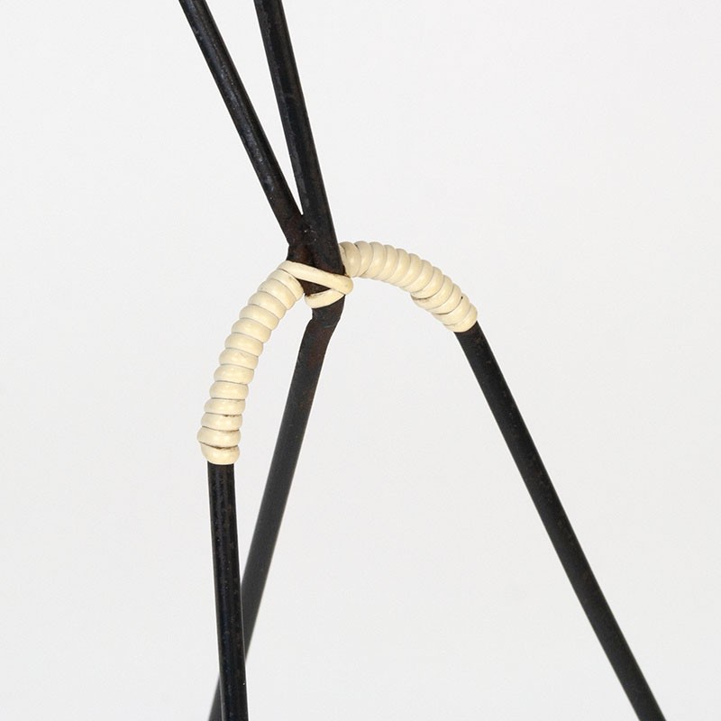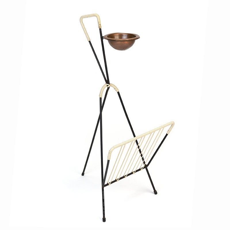 Vintage krantenrek met los liggend koperen asbakje. Bijzondere vormgeving met zwart metaal en kunststof omwikkeld. Bij het handvat is het kunststof wat gesmolten, zie foto. De conditie is verder redelijk goed gezien de leeftijd, zie details. De afmetingen zijn 32,5 cm breed en lang, de hoogte is 63 cm.