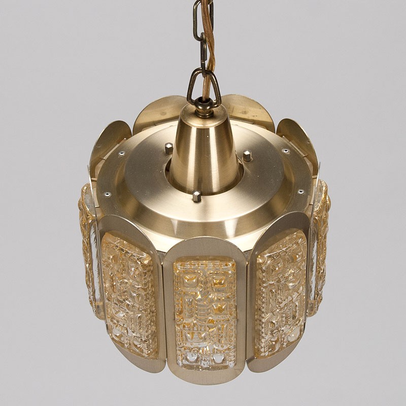 Deense hanglamp uit de periode 1950-1969 van Vitrika. Mooi model met messing armatuur gecombineerd met glas uit de Orrefors glasfabriek. De lamp hangt aan de originele ketting. De conditie is goed, zie details. De afmetingen zijn 18,5 cm in diameter en 20,5 cm hoog.