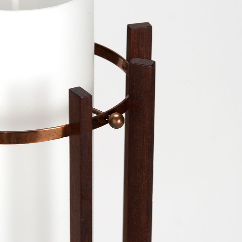 Mid-Century vintage set van 2 Deense hanglampen. De lampen hebben een opaline glazen cilinder als basis, met daaromheen een teakhouten frame met klein koperen detail. De conditie is goed, bij een van de twee lampen heeft het glas rond de koperen buisjes kleine beschadigingen, zie details. De afmetingen zijn 17 cm in diameter ( 9 cm alleen het glas) en 29 cm hoog.